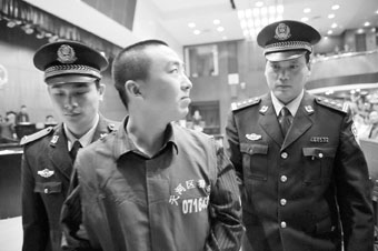 下午3時(shí)10分,待法庭書(shū)記員宣讀完法庭紀(jì)律后,宣判開(kāi)始了。在三百多雙眼睛的注視下,在上百臺(tái)照相機(jī)、攝像機(jī)的聚焦下,許霆被法警押上了被告席。穿著天看(天河區(qū)看守所)1643號(hào)藍(lán)色看守服的許霆,臉上還是那么白,還是那么鎮(zhèn)定。法警解開(kāi)手銬后,他端坐在法庭被告席上,雙手分開(kāi)緊緊地貼在了膝蓋上。負(fù)責(zé)該案的審判長(zhǎng)開(kāi)始宣讀審判書(shū),許霆始終目不轉(zhuǎn)睛地緊盯著他。