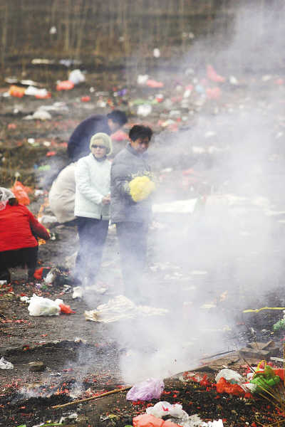 3月29日8時30分,位于石家莊市西郊的河北省雙鳳山革命陵園,緊鄰陵園的道路已是車水馬龍,在陵園設置的集中祭奠點,紙錢燒處,人頭攢動,煙霧繚繞。稍稍有一點風,紙灰就會漫天飄舞。即使有人手捧鮮花來祭奠,也不忘帶上紙錢、冥幣等傳統(tǒng)祭奠品。