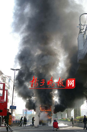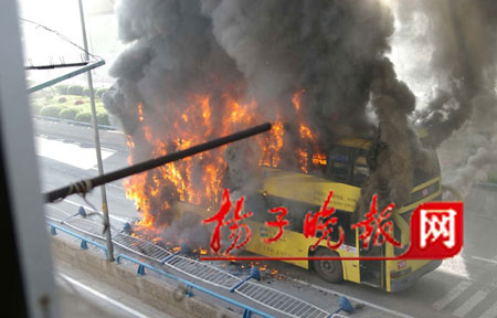 昨天上午7時55分,一輛雙層100路公交車在南京市雨花西路高架橋沿線尾部發(fā)生自燃,濃煙升騰數(shù)十米。時值上班高峰,公交車內(nèi)有乘客60多位。一騎車上班的市民發(fā)現(xiàn)火情后,奮追100多米,向駕駛員通報火情,隨即司機(jī)停車并及時疏導(dǎo)乘客,后因火勢太大,公交車瞬間成了“火”車,還危及地鐵中華門站10多米高正在運(yùn)行的地鐵線。隨即,消防官兵趕到現(xiàn)場,撲救大火。整個過程中,沒有乘客受傷。但是大火將公交車燒成了一個空殼,烤化了附近的店家門面招牌,熏黑了地鐵柵欄,道路旁的植物也被烤死。