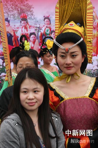 中新網(wǎng)4月19日電 (李洋)4月正是牡丹盛開(kāi)的時(shí)節(jié)!熬W(wǎng)上看河南”采風(fēng)團(tuán)18日先后探訪了洛陽(yáng)國(guó)際牡丹園和國(guó)家牡丹園,遍賞中國(guó)和世界的名貴牡丹品種。當(dāng)?shù)剡組織演藝團(tuán)體盛裝重現(xiàn)唐朝武則天時(shí)期的風(fēng)貌,不少女記者對(duì)武則天這一歷史人物情有獨(dú)鐘,還紛紛與“武則天”合影留念。
