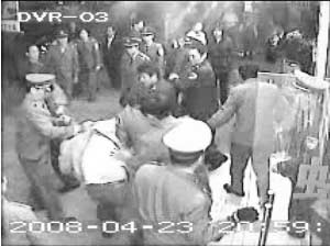 據(jù)錄像資料顯示,當(dāng)晚8點(diǎn)58分20秒左右,在收銀臺(tái)前,被城管人員圍攻的王騏嘗試自衛(wèi),還手打了其中一名城管人員。其余幾名城管人員見狀,一起撲上來,有的按住他的脖子,有的扯住他的衣服,有的揮拳打上去。但寡不敵眾,僅幾秒鐘,五六名城管人員將王騏控制住,將其拖出小店。