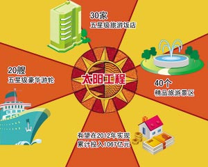 “太陽”工程主要包括建20艘五星級豪華游輪,30家五星級旅游飯店以及40個精品旅游景區(qū)等內(nèi)容。工程有望在2012年實現(xiàn),累計投入1067億元。