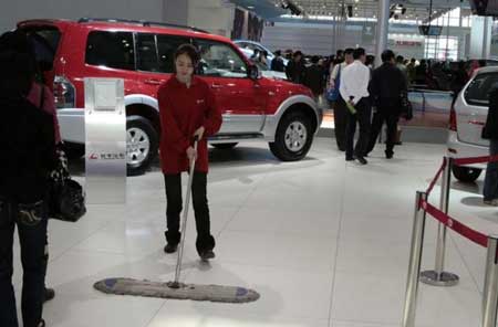 接下來(lái)的事情讓攝影者幾乎落淚:清潔妹妹在為輪胎拋光,當(dāng)時(shí)展臺(tái)上的模特正在走秀,臺(tái)下很多專業(yè)的攝影家們?cè)谕业嘏臄z著,她蹲著從底下擦過(guò)來(lái)的時(shí)候,似乎阻擋了他們的創(chuàng)作,一個(gè)攝影家為了捕捉到那珍貴的大腿,沖上來(lái),伸出大手拉了她衣服領(lǐng)子一下,她趔趄了一下,然后很不好意思地躲開(kāi)了,從照片上看,妹妹仍然盡職地擦著車,但緊閉的雙眼、微蹙的眉頭讓人能一眼看出,她心里很不好受,這張楚楚可憐的照片,令人對(duì)其頓生同情和憐愛(ài)。