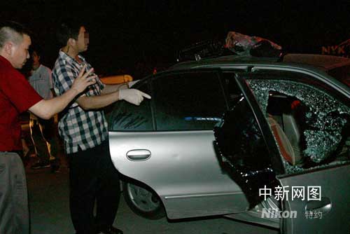 嫌疑人駕駛的轎車在撞上一輛轎車后滑行20多米,撞上路邊的花基停下。民警迅速包圍了轎車,車上4名嫌疑人被擒,并在轎車上繳獲子彈已經(jīng)上了膛的雷鳴燈散彈槍一枝、制手槍手槍兩枝。