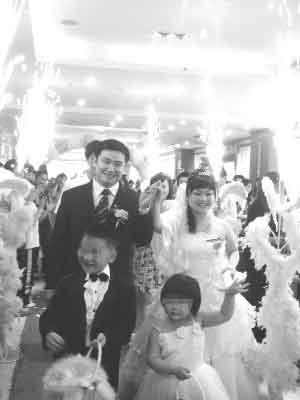 中午12時30分,婚禮正式開始。叮叮和小伙伴一人手提一個裝滿花瓣的小花籃,在玫瑰花亭下站好。當主持人宣布新人入場時,兩人相對而立,隨后帶領(lǐng)新郎新娘緩緩踏上紅地毯。叮叮右手提著花籃,左手抓起一把玫瑰花瓣,用力向空中撒去,始終笑呵呵的,直到把新人帶到婚禮主舞臺。這時,伴娘送上一個“仙女棒”,“我是愛神派來的小天使,我來喚醒你們的愛情……”叮叮拿起“仙女棒”,踮起腳尖走到新郎新娘面前,朝新人手中的水晶球輕輕一點,只見水晶球里藍光四射,現(xiàn)場掌聲一片。