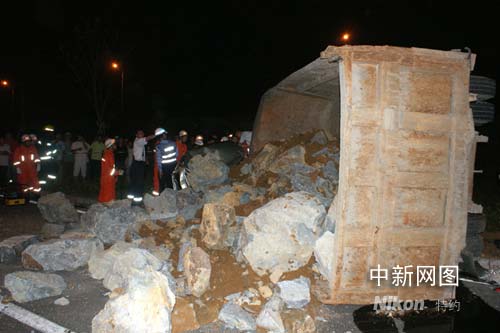 在事故現(xiàn)場,記者看到一輛滿載石頭的工程車側(cè)翻壓在一輛面包車上,地面撒滿了玻璃碎片和石頭,面包車嚴重變形,2名人員被困,其中一名女子經(jīng)現(xiàn)場救護人員診斷稱由于失血過多已死亡,另一名被困人員被壓在了工程車下面,不能動彈,生命垂危。