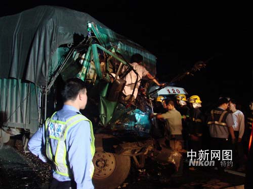 事發(fā)8日晚上22時(shí)許,離韶關(guān)市區(qū)南約80公里的京珠高速公路距韶關(guān)翁城出口一公里處,一輛湖南號牌大貨車追尾撞上一輛廣東號牌大貨車,追尾大貨車的駕駛室嚴(yán)重變形,車頭向內(nèi)凹進(jìn),駕駛室內(nèi)3 名人員受傷被困,其中副駕駛員情況最嚴(yán)重,滿臉是血,身體被嚴(yán)重變形的車頭損壞部件死死卡住,不時(shí)發(fā)出低微的求救聲。