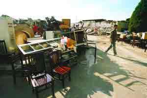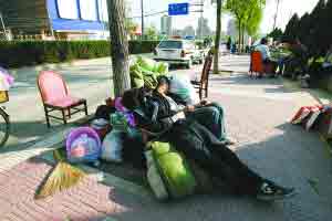 昨日下午3時30分許,修建中的地鐵十號線太陽宮站東北側(cè),冰箱、啤酒箱、柜子、煤氣罐、桌子及一百多張椅子堆放在人行道上,幾名青年男女正倚靠著堆在樹邊的被褥打盹。他們工作的飯店原本有約3000平方米,如今卻成為一片廢墟。