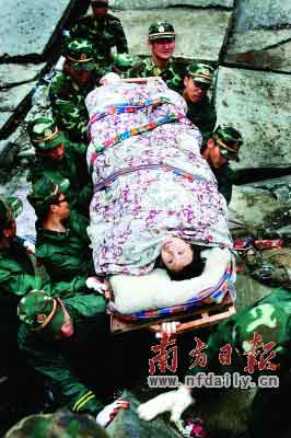 14日,北川縣城的大規(guī)模搜救進(jìn)入第二天,進(jìn)行救援的紅軍師裝甲團(tuán)官兵告訴記者,與前一天不同,他們今天將展開拉網(wǎng)式排查。而在一片斷壁殘垣的北川縣,在一片黑暗的廢墟下,許多受困群眾在不屈不撓地與死神作斗爭,并最終贏得了生存的希望。