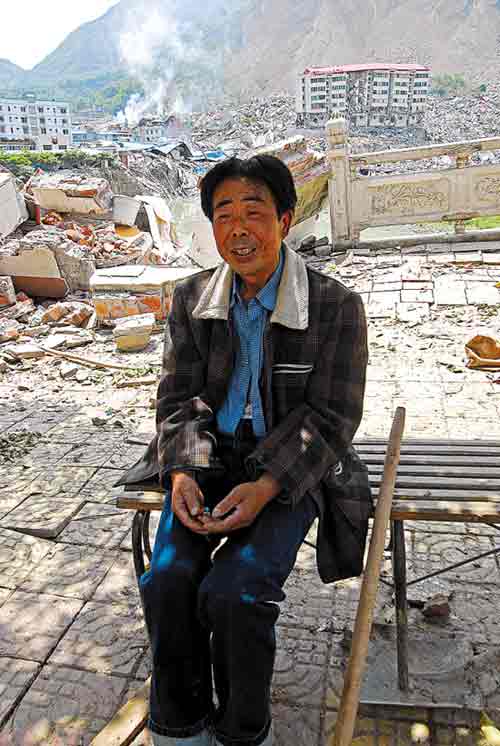 14日下午,當(dāng)所有救援人員撤退后,北川縣城的街道幾乎空無(wú)一人,周圍的廢墟里都是尸體,并靜得令人恐懼。然而,開了一輩子車才剛剛退休一年的周康龍,坐在河邊的凳子上,始終不肯離開。他身旁不遠(yuǎn)處的六樓,就是他的家,可現(xiàn)在有一半已在地震中倒塌了。