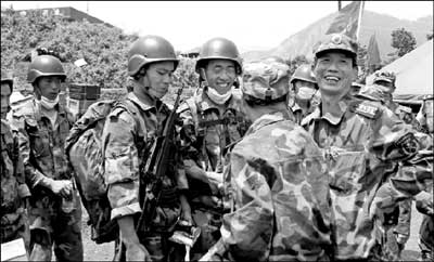 家在四川,同樣受災的戰(zhàn)士伍載鴻說:“我家遭了災,房子倒了沒有關系,可以再建。只要親人還活著就好。讓爸爸媽媽放心,我這也是抗震救災。請黨和政府放心,我不會落下一個受災的鄉(xiāng)親。目前的困難是暫時的,我們一定能渡過難關。再苦再累也要把這個任務完成,只要有一個老百姓有生存的希望,我們都不放棄!”