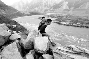 走了大半天,前方的路被新落下的大石擋住,如果要過去,記者必須雙手扒著石頭,側(cè)身挪過。但這樣,孩子便會(huì)被置于半空,萬一孩子手一松,瞬間就會(huì)跌入大江。