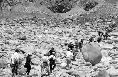 導(dǎo)游和師傅一前一后,護(hù)送著游客徒步往都江堰方向進(jìn)發(fā)。在前行大約5公里后,公路路面已被滑落的山體及大量的石塊完全中斷。游客們只能手腳并用地翻過(guò)路障。其中很多老年人根本沒(méi)有辦法翻越兩米多高的石堆,于是師傅在后邊推、導(dǎo)游在上邊拉,總算通過(guò)了這段障礙。