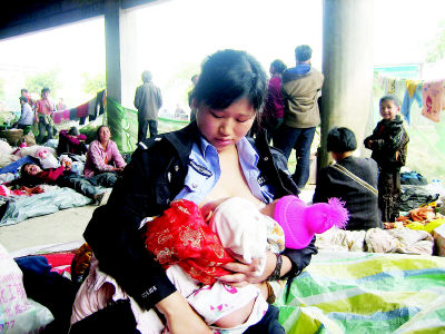 北川縣陳家壩鄉(xiāng)太紅村7組村民楊金玉的丈夫被埋在了廢墟中,由于傷心過(guò)度,楊金玉斷了奶,只有兩個(gè)月大的兒子便再也沒(méi)有吃上奶。北川縣陳家壩鄉(xiāng)平溝村二組村民劉蓉的女兒陳星星剛滿5個(gè)月。劉蓉由于受到地震驚嚇,奶水嚴(yán)重不足。還有母親受重傷、僅3個(gè)月大的嬰兒母瑤瑤……