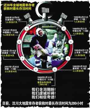 湖南的醫(yī)療隊介紹,7時許,老太太被抬上救護(hù)車緊急送往彭州醫(yī)院。從12日下午被埋開始到被解救的196小時,老太太沒有吃任何東西,只是間歇地喝了點(diǎn)雨水。醫(yī)生介紹,老太太神志比較清晰,已被送到成都華西醫(yī)院治療。