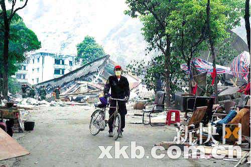 劉相宇第二次進(jìn)映秀時(shí)撿了一輛自行車(chē)查看災(zāi)情。