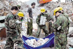 在長(zhǎng)達(dá)6天的搜救過程中,北川縣日益成為危城。官兵們將資金、食品急送至鄰近的謝家坪村,那里有36戶受災(zāi)群眾;18日,他們將大量群眾轉(zhuǎn)移至安全地帶……同時(shí),他們冒著余震不斷、堰塞湖隨時(shí)可能決堤的危險(xiǎn)晝夜作業(yè),先后3次緊急修改搜救方案,共救出9名幸存者,并于21日傍晚成功挖出金庫(kù)庫(kù)款。官兵們將廢墟中散碎的人民幣逐一收撿入兩個(gè)大袋子,5個(gè)存放大量現(xiàn)金的保險(xiǎn)柜也被逐一發(fā)掘出來(lái)——18時(shí)20分,第一批資金被清點(diǎn)出來(lái);19時(shí)20分,搜救工作結(jié)束,北川信用聯(lián)社620余萬(wàn)元資金完好無(wú)損(如圖)!官兵們繼續(xù)搜尋,包括記錄資金信息的筆記本電腦、憑證等均被搶救出來(lái)。