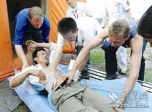 5月24日,汶川大地震后第12天,陽光投射在彭州市職業(yè)中學操場上的20座巨型充氣帳篷上,不時有高鼻深目的“老外”進進出出。