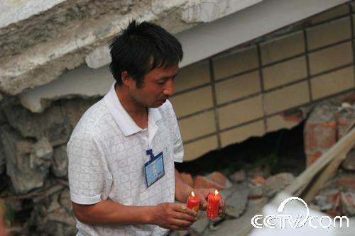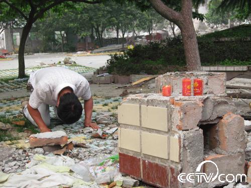 “孩子們,沒有全部救出你們我很內(nèi)疚,我會記住你們忌日的,每年的這一天我都會來看你們,給你們送學(xué)習(xí)用品。你們生前都很團(tuán)結(jié),在天堂也要相互關(guān)照好,老師每天都在想念著你們!”在北川中學(xué)(新區(qū))的廢墟下,記者看到一名中年男子跪在地上,哭得很悲傷,還向遇難的同學(xué)叩拜。記者跑過去一看,此人就是北川中學(xué)的校長劉亞春。他告訴記者,地震后他一直在忙碌搶救學(xué)生的事,沒有時間來看望這些還埋在廢墟下的數(shù)百名學(xué)生。今天他在百忙之中,抽時間來看看這些孩子們,他將帶來的蠟燭點燃后放在廢墟下,雙手合十,默默地祈禱,然后跪在地上給在地震中失去生命的學(xué)生磕了三個響頭。