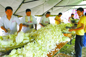 土坡上挖幾個大坑,直徑一米多的大鐵鍋架起來,半鍋水沸騰,直徑一米的大圓木桶立在鍋中。“火旺點,再旺點!币粋小伙兒往坑內(nèi)塞木板,他五米外的木板堆,近一人高。旁邊大桶的米飯率先出爐,廚師劉福彬用臉盆當飯勺。煮飯區(qū)旁邊,堆起的圓白菜面積像籃球場那么大。幾位女廚用大刀切菜。