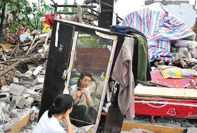 到綿竹漢旺鎮(zhèn),已是夜晚,黑魆魆中,一片片斷壁殘垣齜牙咧嘴,仿佛巨大的怪物。住在廢墟旁帳篷里的一家人告訴我,旁邊就是曾經(jīng)溫馨繁盛的家,曾經(jīng)經(jīng)營著建材和婚慶禮品的家。如今兒子遇難,人去樓空。在火車站的廢墟上,一位老人顫顫巍巍地說:“這下面曾經(jīng)埋葬了10多個人,上午見面還笑嘻嘻,下午就……”這10多個人被挖出來時都是一個姿勢:一手捂頭,一手伸向前方,仿佛要擋住轟然倒塌的巨物……