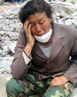 那邊是盼望著孩子歸來(lái)的母親,一名坐在書(shū)堆上的婦人已經(jīng)泣不成聲。她說(shuō),大地震令她死了兩個(gè)孩子,其中一個(gè)剛滿17歲,都還沒(méi)有找到,等待消息的日子,她都吃不下東西。她一面頻頻回頭看著遠(yuǎn)遠(yuǎn)的挖掘現(xiàn)場(chǎng),一面說(shuō),如果挖出了她的孩子,她無(wú)論怎樣都會(huì)認(rèn)得出來(lái),因?yàn)楹⒆宇i項(xiàng)上還戴著一塊玉,是龍的形狀。說(shuō)罷,她又再滿懷希望地沖向抬著擔(dān)架的救援人員……。