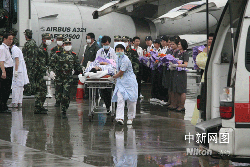 十一點(diǎn)左右,傷員一個個被武警官兵抬出飛機(jī),并送上等候在停機(jī)坪上的三十六輛救護(hù)車,并被迅速送往浙江金華三家最好的醫(yī)院接受治療。