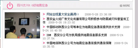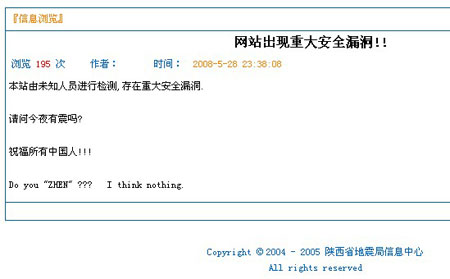 28日23時38分,記者正常登錄到陜西省地震局網(wǎng)站(陜西省地震信息網(wǎng))時,在該網(wǎng)站首頁“四川汶川8.0級地震應(yīng)急”欄目中發(fā)現(xiàn)一條題為“網(wǎng)站出現(xiàn)重大安全漏洞”的信息,點擊進入后內(nèi)容顯示“本站由未知人員進行檢測,存在重大安全漏洞”,并隨后附有三條“網(wǎng)友留言” 。