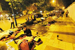 “這幾天還少了些,最恐怖的時候,市區(qū)二環(huán)周圍全部睡滿了人!蔽靼补こ檀髮W的一學生告訴記者,“那段時間,同學們都把床單鋪到學校操場上,一個大操場一下就睡滿了。我還有個同學為了躲避地震,沒拿到畢業(yè)證就‘逃’到北京避災去了!