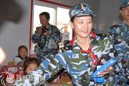 海軍少將宋祖英赴四川綿竹和小學生過兒童節(jié)(圖)