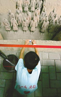 昨日,臨潼溫度高達33攝氏度,熾烈的陽光并沒阻擋人們參觀的熱情。這也是汶川地震發(fā)生后第一個大型節(jié)假日。早上9時,記者在兵馬俑售票處看到,兩個窗口排滿了大約15個人,而另外幾個窗口則“冷清”很多。大量來自省內(nèi)的游客在購票進場。