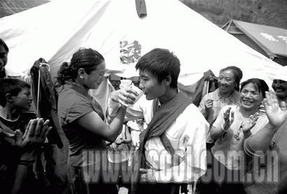 “親一個,親一個!”在滔滔的岷江邊,在凌亂的廢墟旁,在簡單的帳篷里,這樣的聲音對遭遇特大地震災害后的汶川而言,顯得久違而珍貴。正是在這個重災區(qū),在鄉(xiāng)親們熱情的呼喊中,昨日上午,汶川縣威州鎮(zhèn)雙河村的一對年輕羌族戀人攜手走進婚姻殿堂,為這個劫后重生的地方增添了一些喜氣。