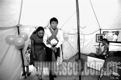 沒有床怎么辦?幾個年輕人跟隨王小波來到廢墟中,費了很大勁,硬是從中把新床、新被單、毯子和被子給掏了出來。不過,王小波感到有些遺憾,因為沒有把結(jié)婚證找到!斑不錯,靠大家?guī)兔,現(xiàn)在啥子都整好了!弊蛉丈衔缯脚e行婚禮前,王小波帶著記者進入到帳篷“洞房”中。在這個白色素雅的帳篷里,一架嶄新的床擺放在中央,上面鋪著嶄新的毯子、被子。一些好心的鄉(xiāng)親還專門給這對新人找來一些紅布,懸掛在帳篷頂上,為這個簡單的“洞房”增添了喜慶氣氛。