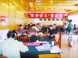 地稅局、國(guó)稅局、物價(jià)局、財(cái)金辦……四個(gè)紅色的牌子立在一張鋪有綠布的長(zhǎng)桌上,每個(gè)牌子后面都有一名公務(wù)員在值班。長(zhǎng)桌共計(jì)有11張,每張桌子上都至少擺放著三個(gè)單位的牌子——宣傳部、廣電局、人武部、組織部……根據(jù)初步統(tǒng)計(jì),在天龍賓館70平方米的餐廳里,有北川45個(gè)單位在緊張有序地辦公。