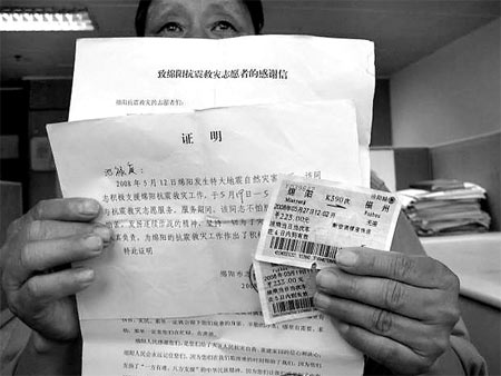 昨日中午,池先生向記者出示了身份證、退伍軍人證、往返車票及綿陽市志愿者協(xié)會開具的證明和感謝信。池先生表示,雖然他違反勞動紀律在先,但是公司也不能扣下他之前的加班費。