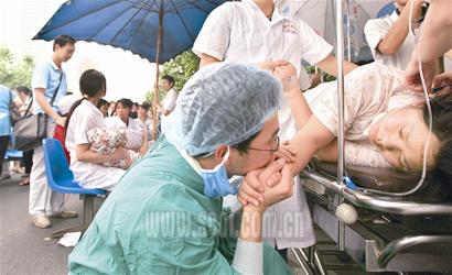 市民們和醫(yī)生心手相連的場面打動了每一位路人,也刺激著我的快門不停響動。透過人群中的縫隙,一幕畫面深深地打動了我的心靈,只見一位身穿手術服,頭戴消毒帽的年輕男子正蹲在一臺擔架車旁,握著一位虛弱的產(chǎn)婦的手,無言地對視著,他們正等待著小生命的降臨。突然,男子將她的手放在唇邊,輕輕一吻,就像在說:老婆,你不要怕,一定不會有事,我們的孩子會平安降生。按動快門的同時,淚水滑過我的眼眶。