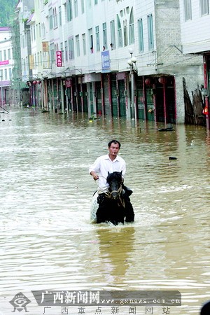 連日強(qiáng)降雨,凌云縣邏樓鎮(zhèn)已變成一片澤國(guó)。圖為鎮(zhèn)上一名居民騎馬出行。