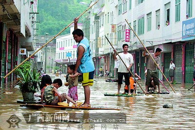 內(nèi)澇淹城鎮(zhèn),居民進(jìn)出很不方便。凌云縣有關(guān)部門調(diào)派了卡車和沖鋒舟,供沿線居民進(jìn)出。記者看到,許多進(jìn)城鎮(zhèn)小車被擋在外面,兩輛卡車由于涉水能力強(qiáng),負(fù)責(zé)運(yùn)送過往的村民和物資。有的市民自制竹伐或涉水工具,渡“河”出行,有的居民還牽出馬來,騎馬過“河”。