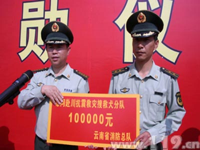 中新網(wǎng)6月12日電 6月6日下午,云南消防總隊在昆明消防訓練基地隆重舉行儀式,授予赴川抗震救災的“銀虎”、“昆虎”、“小虎”、“金雕”、“菲離”、“威嚴”、“飛雄”7條搜救犬“汶川抗震救災英雄犬”稱號。云南消防總隊總隊長王子崗向受表彰的英雄犬頒發(fā)了10萬元獎金。