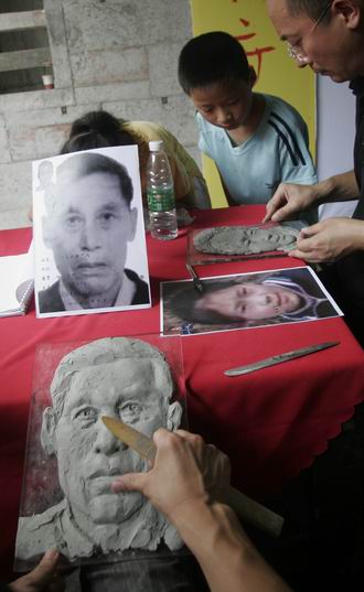 在展場內(nèi),雕塑家們開始現(xiàn)場創(chuàng)作浮雕頭像。每位雕塑家的手邊都有一張真人大小的遇難者失蹤者的正面肖像照,上面還打印著主人的姓名、籍貫、出生日期、死亡日期。雕塑家們將雕塑專用泥土細(xì)心地抹在照片上,然后用雙手捏塑出一個和照片大小完全一樣的浮雕塑像,其后還要經(jīng)過多項工序加工。據(jù)譚云介紹,經(jīng)過精密計算,每塊銅板真人浮雕頭像的制作成本將控制在600元以內(nèi),全部完成預(yù)計將用兩到三年的時間。(華西都市報 記者陶玲 胡曉 攝影朱建國)