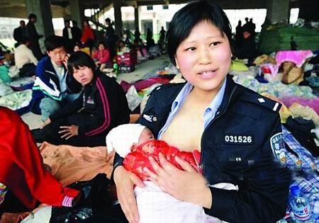 地震發(fā)生后,被轉(zhuǎn)移來的嬰兒除了可以喝一點水和稀飯外,沒有其他東西可吃!按笕诉可以餓、還可以忍,而這些小嬰兒卻不能餓、不能忍!作為母親,我覺得這些孩子太可憐了。正好我還在哺乳期,就讓我來給他們喂奶吧!”在受災(zāi)群眾安置點協(xié)助工作的29歲民警蔣曉娟提出:我去給這些嬰兒哺乳!