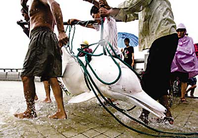 下午4時(shí)10分,村民們將白海豚抬到岸上(見左下圖)。半個(gè)小時(shí)后,白海豚被裝上汽車送往廣州。