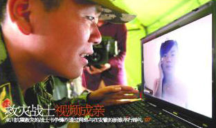 “看見啦!hello,媳婦兒!”昨日16:18,都江堰學(xué)府路一處板房搭建地的綠色帳篷內(nèi),27歲的新郎倌終于看見了電腦屏幕上穿著潔白婚紗的新娘。整個(gè)婚禮僅僅持續(xù)了9分鐘,這是一場簡單得不能再簡單的婚禮,卻跨越了千里!新郎倌因?yàn)殡S部隊(duì)入川參加抗震救災(zāi),無法如期趕回安徽家中與新娘舉行婚禮,便通過這種方式,完成了對新娘的承諾。