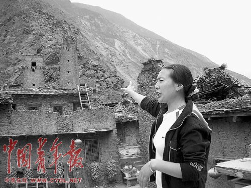 桃坪羌寨的羌族人掛念著附近山頂?shù)募焉秸?00多戶羌人的安危,有人從山上帶下來的消息說,上面房屋垮塌嚴重,有兩名正在房頂曬玉米的老人不幸罹難。