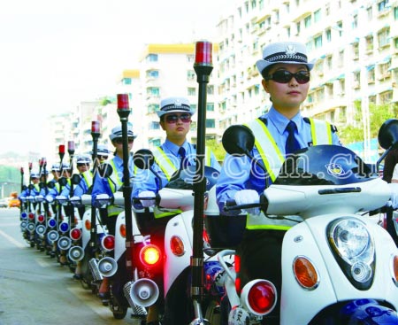 通過嚴格的文化、體能、技能考試和政審后,(貴州)畢節(jié)市交警大隊從畢節(jié)地區(qū)8個縣(市)公安系統(tǒng)考調10名“警花”組建了首支女子交警隊。經過三個多月的封閉訓練,近日,10名美麗漂亮的“警花”正式亮相畢節(jié)街頭,開始在畢節(jié)城區(qū)進行交通巡邏、維護交通秩序等交通執(zhí)法活動。