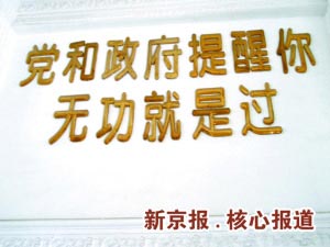 在潁泉區(qū)政府辦公樓大堂里貼著的宣傳口號!∮浾 黃玉浩 攝