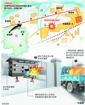 據(jù)張家界警方初步查明,該辦事處彭家巷社區(qū)七組居民田開(kāi)友,因?qū)ψ约疫`法建筑被有關(guān)部門依法拆除產(chǎn)生不滿,于昨日上午駕駛一輛裝有兩個(gè)已點(diǎn)燃的液化氣瓶的農(nóng)用三輪車沖進(jìn)辦事處院內(nèi),在辦公樓前發(fā)生爆炸,爆炸產(chǎn)生的沖擊波造成12名干部和群眾受傷。田開(kāi)友在案發(fā)5分鐘后被警方抓獲。據(jù)了解,西溪坪街道位于張家界市區(qū)東部,東臨慈利縣金巖,南連大坪鎮(zhèn),西接官黎坪街道辦事處,北有澧水河與陽(yáng)湖坪鎮(zhèn)相望,是張家界市新興的旅游工業(yè)開(kāi)發(fā)區(qū),人口3.53萬(wàn)人,轄23個(gè)建制村、3個(gè)居委會(huì)。
