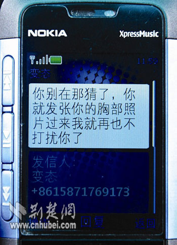 “你只要把胸部照片發(fā)過來,我就罷手。”昨日,收到對方提出的無理要求,漢口女士小霞(化名)精神幾乎崩潰。近半個月來,這樣的下流電話和短信每天都在折磨著她。