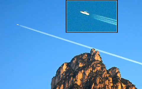 7月13日早上5點40分左右,網友曹先生在河南輝縣八里溝景區(qū)拍攝“石人迎客”景點時,突然看到前方天空有一個白色亮點出現,速度像飛機,形狀又如飛艇,但上部突出,似乎又像傳說中的“飛碟”。不明飛行物第一次出現在“石人迎客”位置的時間是5:39,但尾部沒有噴氣,5分鐘后,不明飛行物第二次出現在這個位置,時間是5:44,尾部拖著一條長長的尾巴,好像在不大的半徑里繞圈飛行,而且在飛行過程中一直沒有聽到其發(fā)出聲音。曹先生趕緊用相機將其拍攝了下來(如圖),雖然不是長焦鏡頭,但由于用了三腳架,能夠比較清晰地看出不明飛行物大概的樣子。