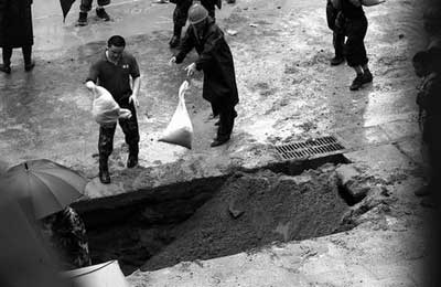 工地工人開始往坑內(nèi)投擲沙袋,附近沙袋很快用完。10時45分,第一輛水泥罐車開到坑口,混凝土被倒進深坑,隨即又有多輛汽車運來混凝土,將深坑填滿。